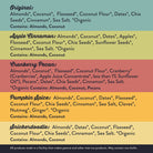 Core Ingredients: Almonds, coconut, chia seeds and flax seeds - lightly sweetened with dates and a hint of cinnamon and sea salt with dried fruit and spices depending on the flavor.