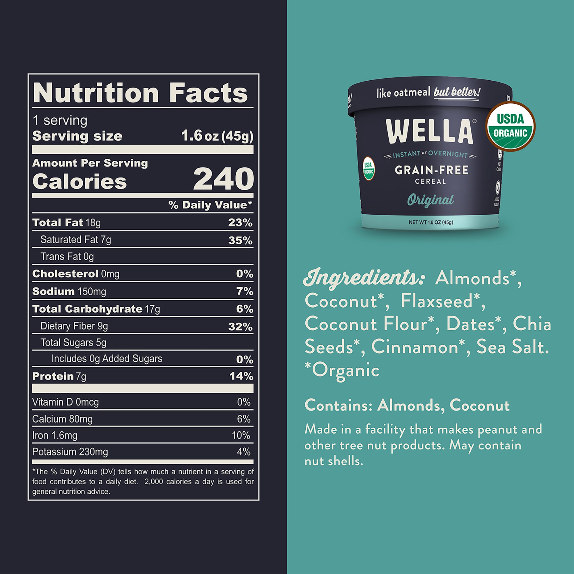 Yummy, Fast, Portable, Instant or Overnight. Incredible taste meets convenience. This gluten free, grain free cereal is packed with energy powered by protein, healthy fats and plant-based ingredients. Lightly sweetened with wholesome dates, Wella’s high protein organic cereal is crafted with 5 superfoods and no artificial or refined ingredients. - Grain Free, Gluten-Free, Paleo, Vegan, No Added Sugar. Using only organic and non-GMO ingredients, this is as wholesome as breakfast can get. High fiber and delicious, this comforting and satisfying organic oatmeal alternative gluten free cereal will surely be your newest pantry staple you can feel great about.