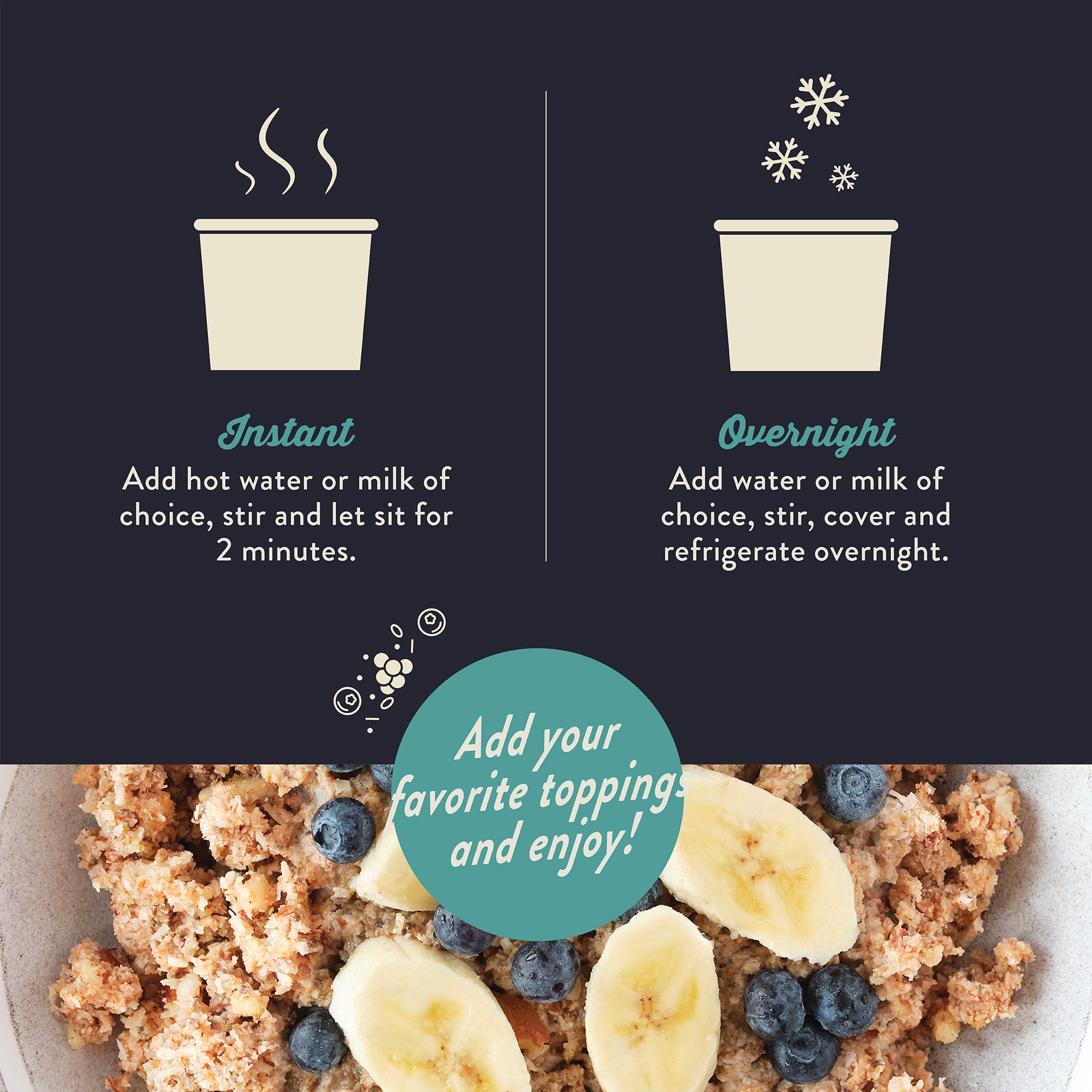 Simply pour Grain-Free Cereal into a bowl or travel mug, and add hot water or your favorite milk. Enjoy hot or cold, instant or overnight, as is, or with your favorite toppings.