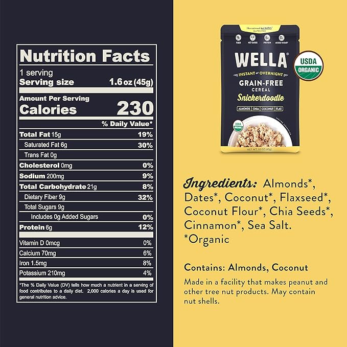Yummy, Fast, Portable, Instant or Overnight. Incredible taste meets convenience. This gluten free, grain free cereal is packed with energy powered by protein, healthy fats and plant-based ingredients. Lightly sweetened with wholesome dates, Wella’s high protein organic cereal is crafted with 5 superfoods and no artificial or refined ingredients. - Grain Free, Gluten-Free, Paleo, Vegan, No Added Sugar. Using only organic and non-GMO ingredients, this is as wholesome as breakfast can get. High fiber and delicious, this comforting and satisfying organic oatmeal alternative gluten free cereal will surely be your newest pantry staple you can feel great about.