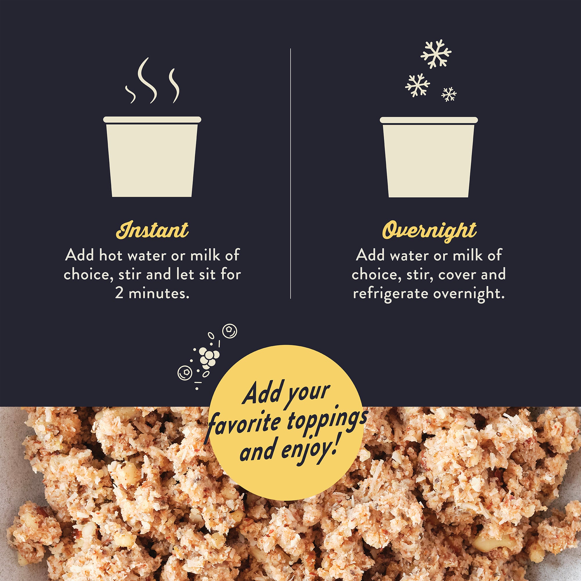 Simply pour Grain-Free Cereal into a bowl or travel mug, and add hot water or your favorite milk. Enjoy hot or cold, instant or overnight, as is, or with your favorite toppings.