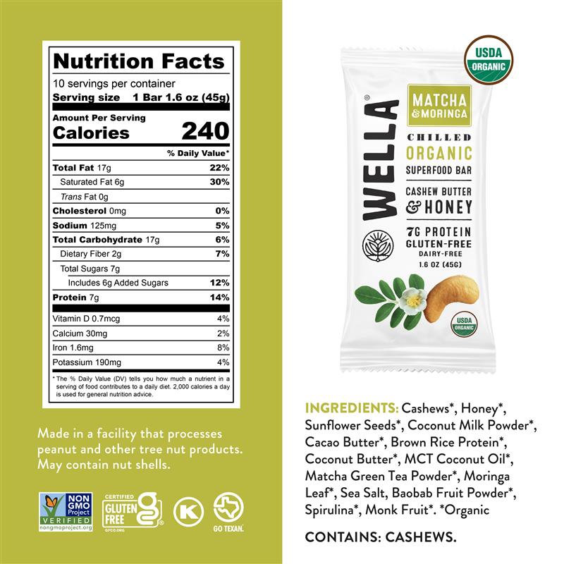 This bar takes plant power to a whole new level! Packed with premium Japanese matcha*, moringa leaf*, spirulina and brown rice protein in a rich cashew and cacao butter base, we add dried coconut milk for extra creaminess. Lightly sweetened with wildflower honey and monk fruit, we added a pinch of tart baobab fruit to compliment the earthy matcha flavor. Naturally energizing, with healthy fats and plant protein to keep you full, this bar is here to keep you going on those busy days!