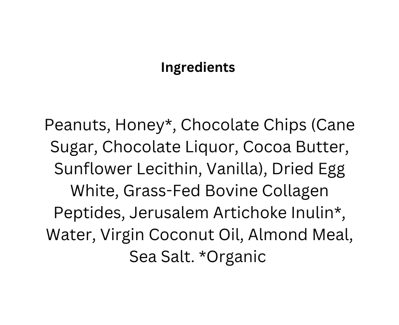 Peanuts + Chocolate – a match made in heaven! Our creamy blend of peanut butter and organic, bee-friendly honey gets an energizing boost from decadent chocolate chips. With 15 grams of complete protein from grass-fed collagen and egg white protein to nourish you from the inside out, and prebiotics to support gut health, this bar will keep you energized and satisfied long after the last, delicious bite!