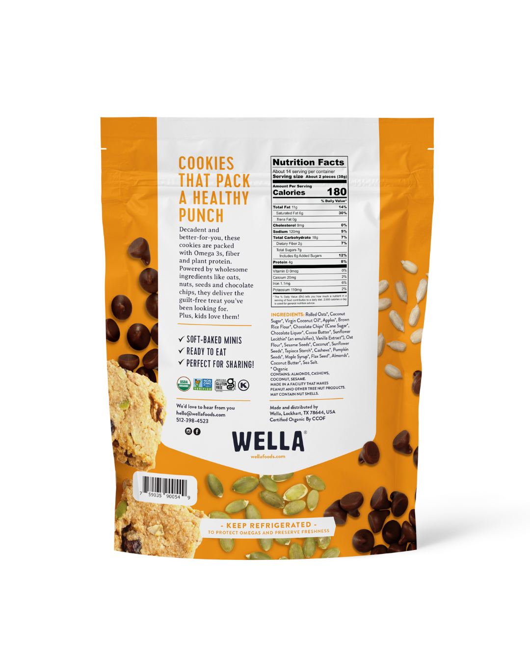 Try a bag of each of our new Wella Super Omega Squares! These squares are a tender and delicious 'better-for-you' snack loaded with everything you want more of - Omega 3, fiber and plant protein. Organic, gluten-free and made from wholesome ingredients - oats, nuts, seeds and vegan chocolate chips and dried fruit. Nothing fake or refined. Great straight from the bag, or bake for 4 minutes for a toasty oven fresh treat. Either way, they won't disappoint!